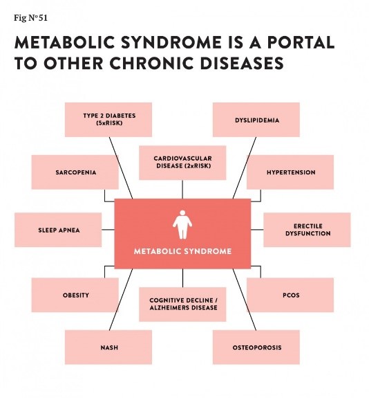 Stressi syytää suuria määriä rasvaa yhdessä esim. suurten ns. proinflammatorisisten sytokiinimäärien kanssa (kuten esim. IL-6 yhdessä PAI-1-nimisen tekijän kanssa – plasminogeeniaktivaattori-inhibiittori-1, jonka tiedetään muun muassa hallitsevan voimakkaasti veren hyytymistä). On havaittu, että stressin aiheuttama lisääntyminen proinflammatorisissa ja hyytymistä estävissä tekijöissä veressä vaikeissa tilanteissa voi nousta 1000 kertaisesti ja siten indusoida valtavan rasvakertymän maksassa, luoda insuliiniresistenssin ja myötävaikuttaa useisiin sairauksiin, kuten oheisessa kuvassa tiivistetään: sydän-ja verisuonitauti, korkea veren rasva (dyslipidemia), korkea verenpaine (hypertensio) (6), impotenssi (erektiohäiriöt), munasarjakystat (munasarjojen monirakkulatauti), dementian aiheuttaja (kognitiivinen dekriini), luukato (osteoporoosi), liika rasva maksassa (NASH – maksan ei alkoholista johtuva rasvoittuminen) , samoin kuin yleinen liikalihavuus, uniapnea, lihasten surkastuminen (sarkopenia) ja 2-tyypin diabetes.
